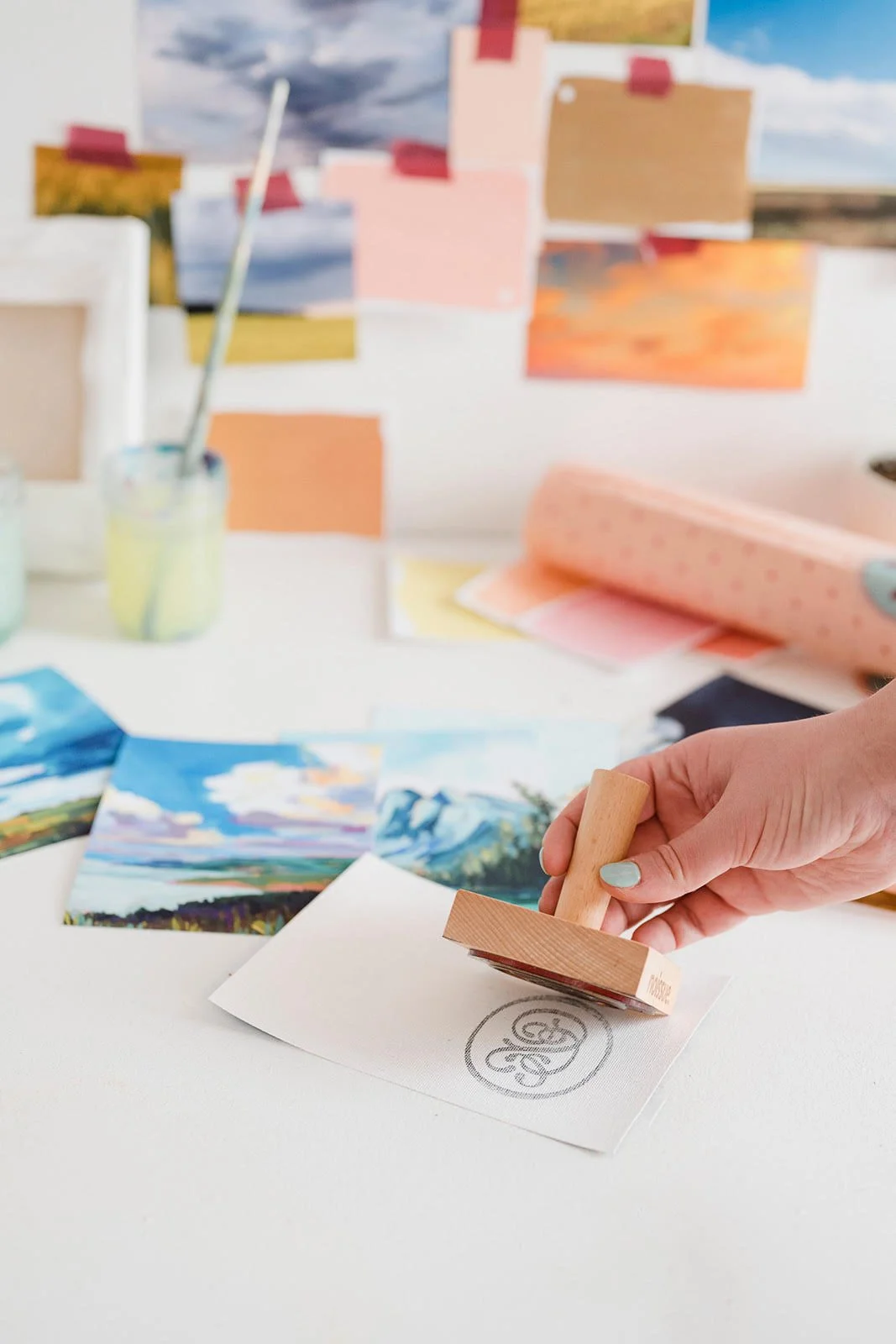 The custom monogram acts as Amy’s stamp of authenticity, her signature. Artful in its own way, it acts as a supporting visual that ads strength to her work. The showstopper is the pictogram — already present in her brand (original image by Karmen Meyer), it immortalizes her in shape and colour and captures her plein air painting (painting outside).